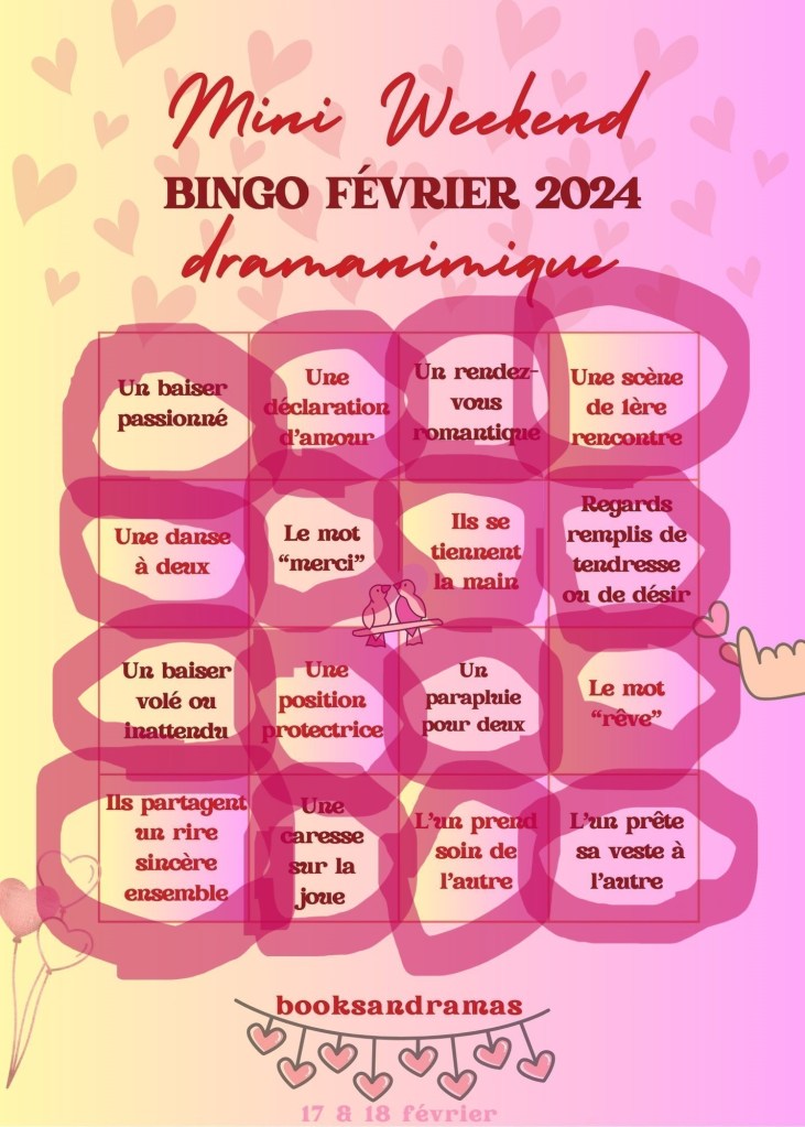 Il permettra d’échanger entre dramavores (sur twitter et/ou les blogs de chacun), de partager nos ressentis durant ce week-end. Il se déroulera du samedi 17 février à 00h00 et se terminera le dimanche 18 février 2024 à 23h59.